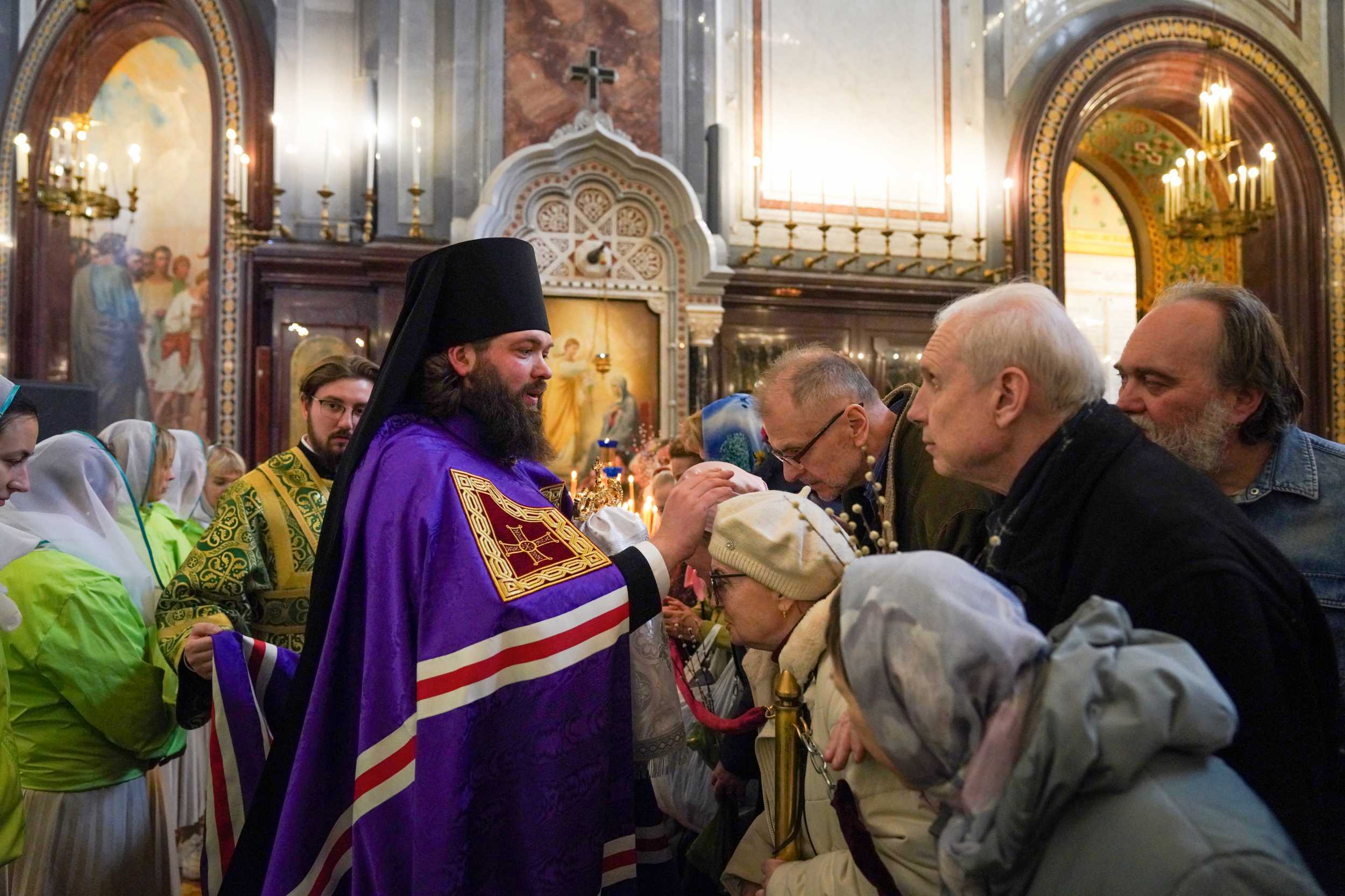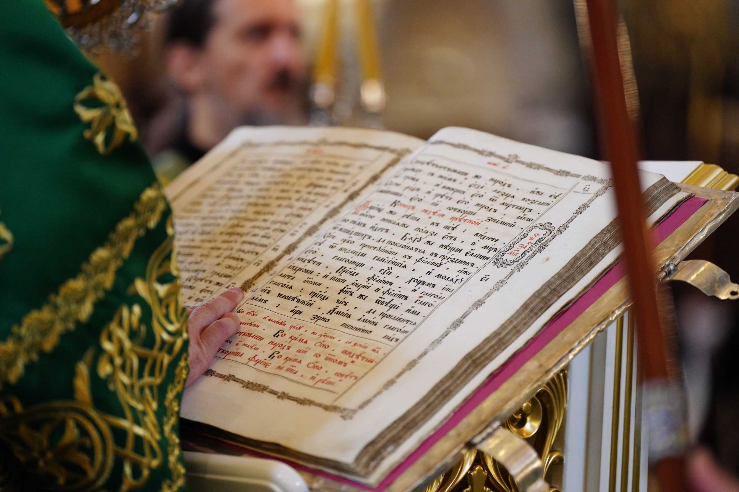 На сугубой ектении были вознесены особые прошения, Святейший Владыка прочитал молитву о Святой Руси.