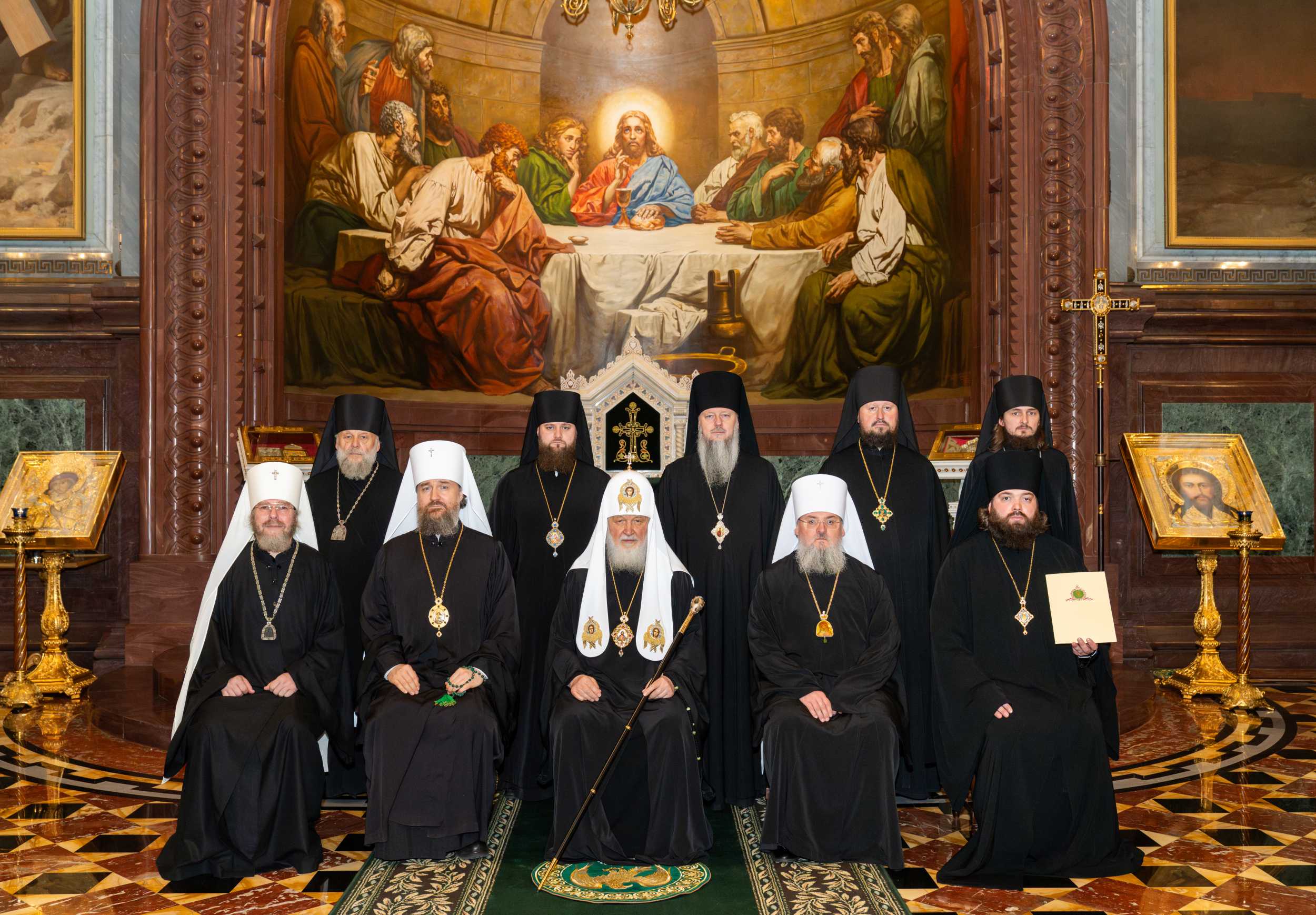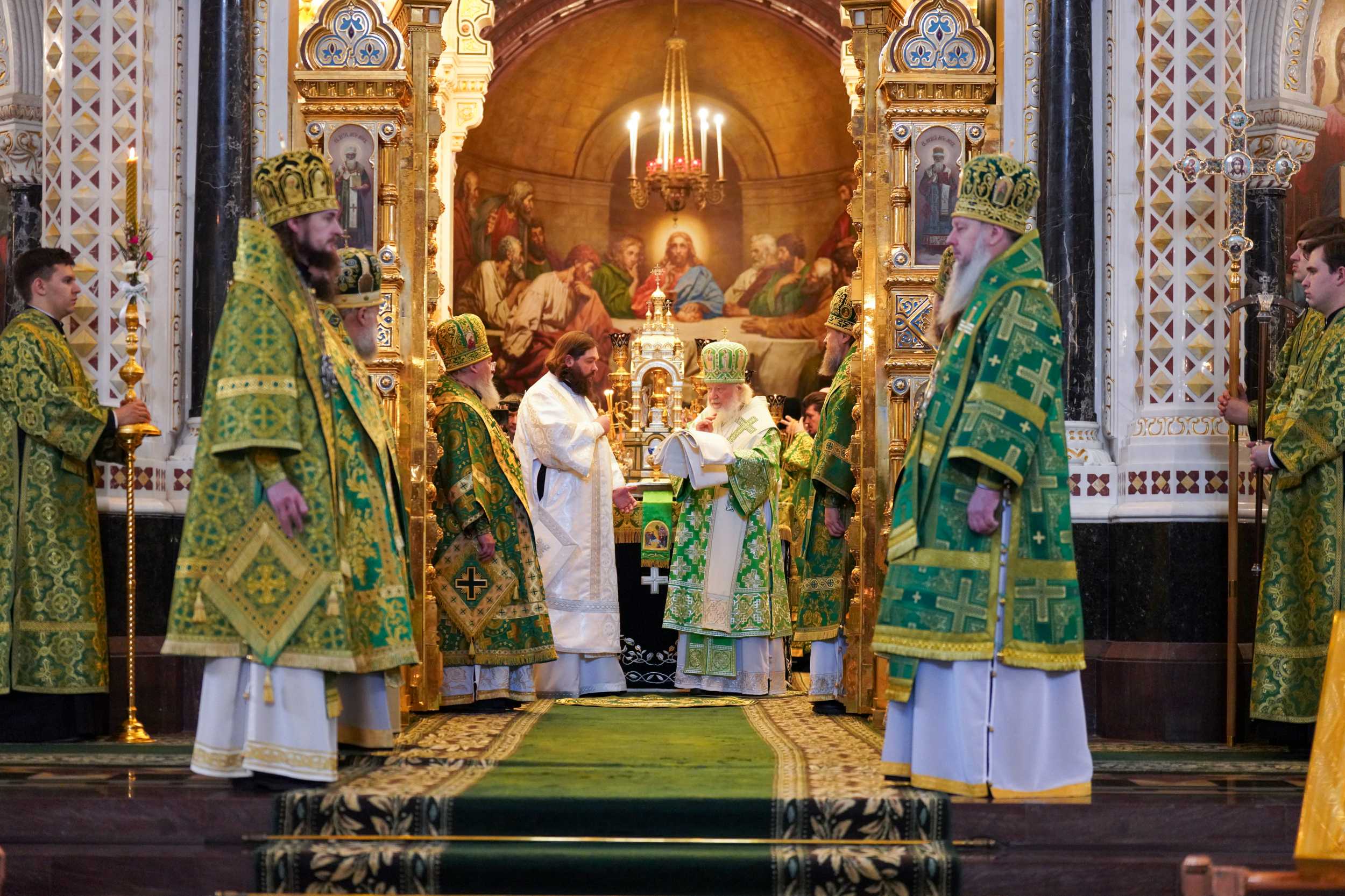 За Литургией Его Святейшеству сослужили: митрополит Воскресенский Григорий, управляющий делами Московской Патриархии, первый викарий Патриарха Московского и всея Руси по г. Москве; митрополит Симферопольский и Крымский Тихон, председатель Патриаршего совета по культуре; епископ Красноярский и Ачинский Никита; епископ Ялтинский Нестор, викарий Симферопольской епархии; епископ Енисейский и Лесосибирский Игнатий; епископ Коктебельский Агафон, викарий Феодосийской епархии; епископ Джанкойский и Раздольненский Алексий; епископ Раменский Алексий, личный секретарь Святейшего Патриарха Кирилла; протопресвитер Владимир Диваков, секретарь Патриарха Московского и всея Руси по г. Москве; протоиерей Михаил Рязанцев, ключарь Храма Христа Спасителя; архимандрит Филарет (Булеков), заместитель председателя Отдела внешних церковных связей Московского Патриархата; протоиерей Александр Фарковец, благочинный Донского церковного округа Московской (городской) епархии, настоятель храма Ризоположения на Донской г. Москвы; протоиерей Дионисий Казанцев, секретарь Святейшего Патриарха по Московской области; протоиерей Иоанн Пристинский, секретарь Симферопольской епархии, настоятель храма пророка Илии в г. Саки; иеромонах Пафнутий (Попов), насельник Иосифо-Волоцкого ставропигиального монастыря; протоиерей Николай Соколов, настоятель храма святителя Николая Мирликийского в Толмачах г. Москвы; игумен Иоанн (Лудищев), наместник Сретенского ставропигиального монастыря, ректор Сретенской духовной академии; духовенство Крымской митрополии и г. Москвы.