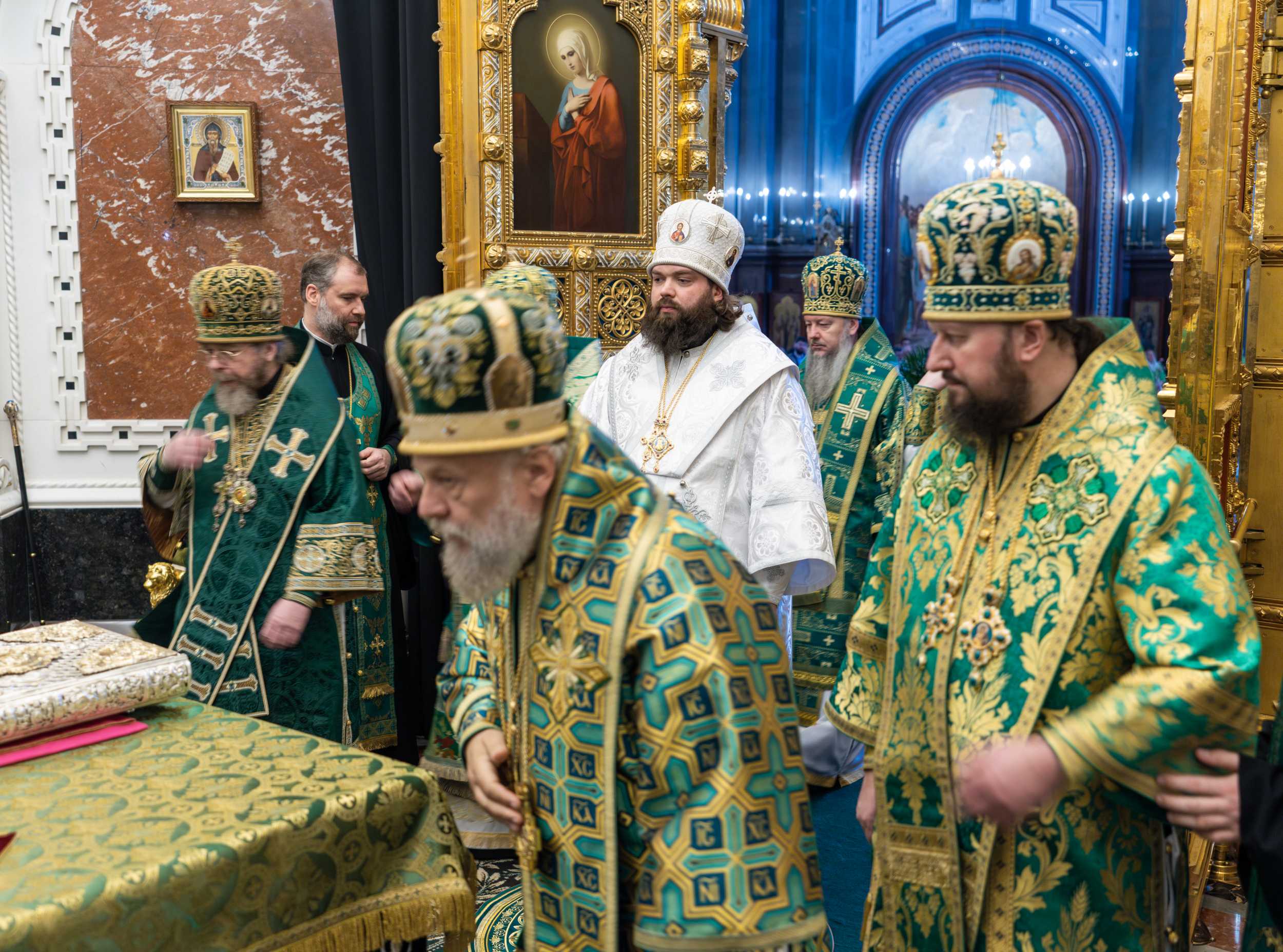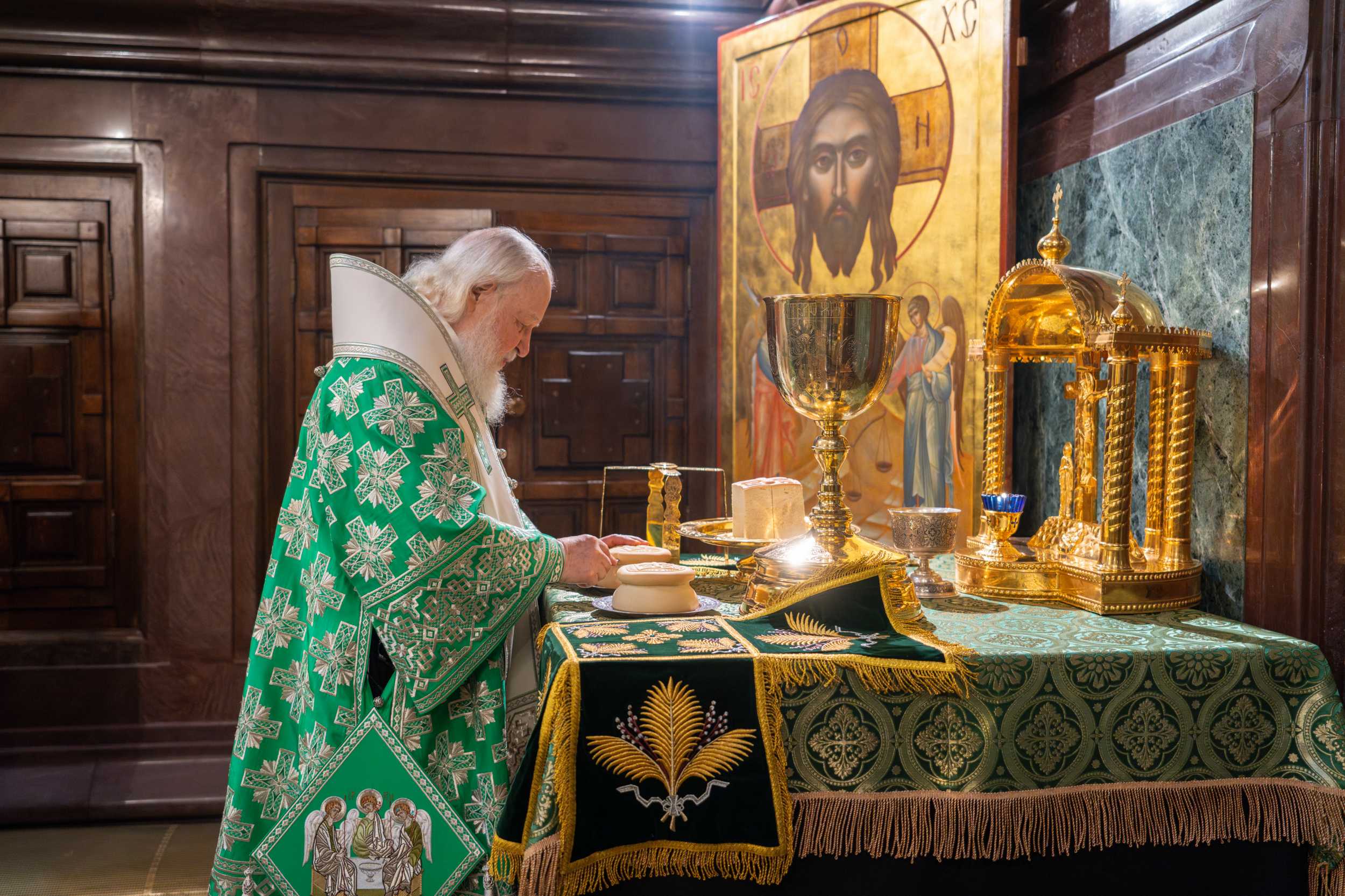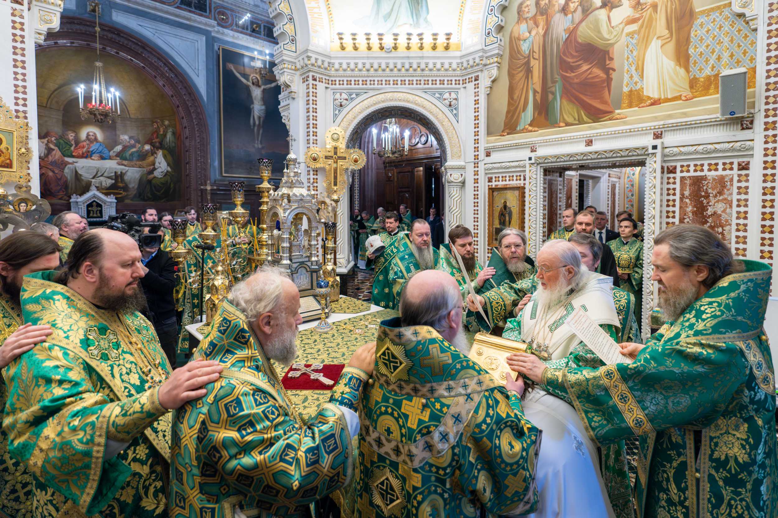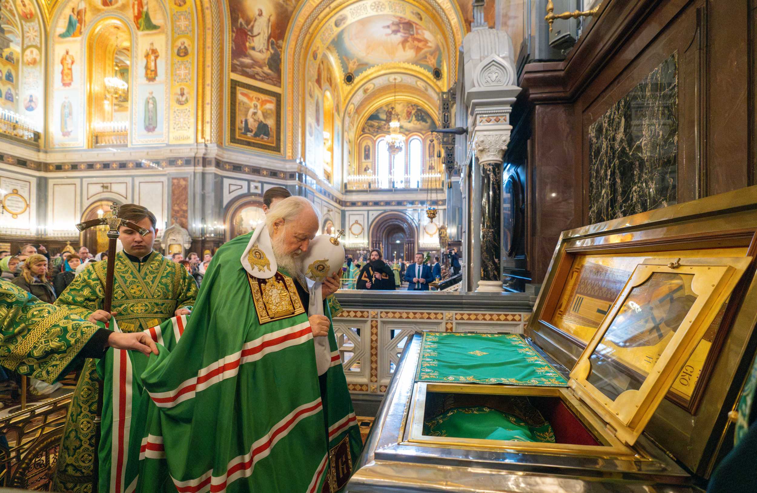 По прибытии в Храм Христа Спасителя перед началом богослужения Предстоятель Русской Православной Церкви поклонился честным мощам святителя Филарета, митрополита Московского.