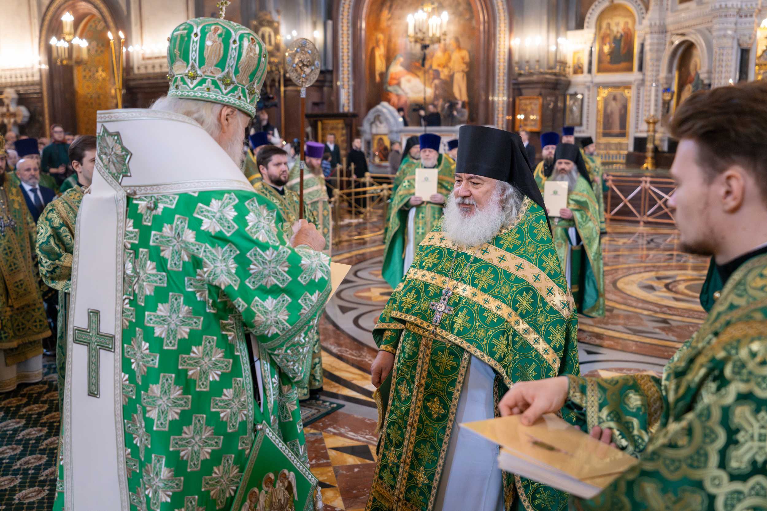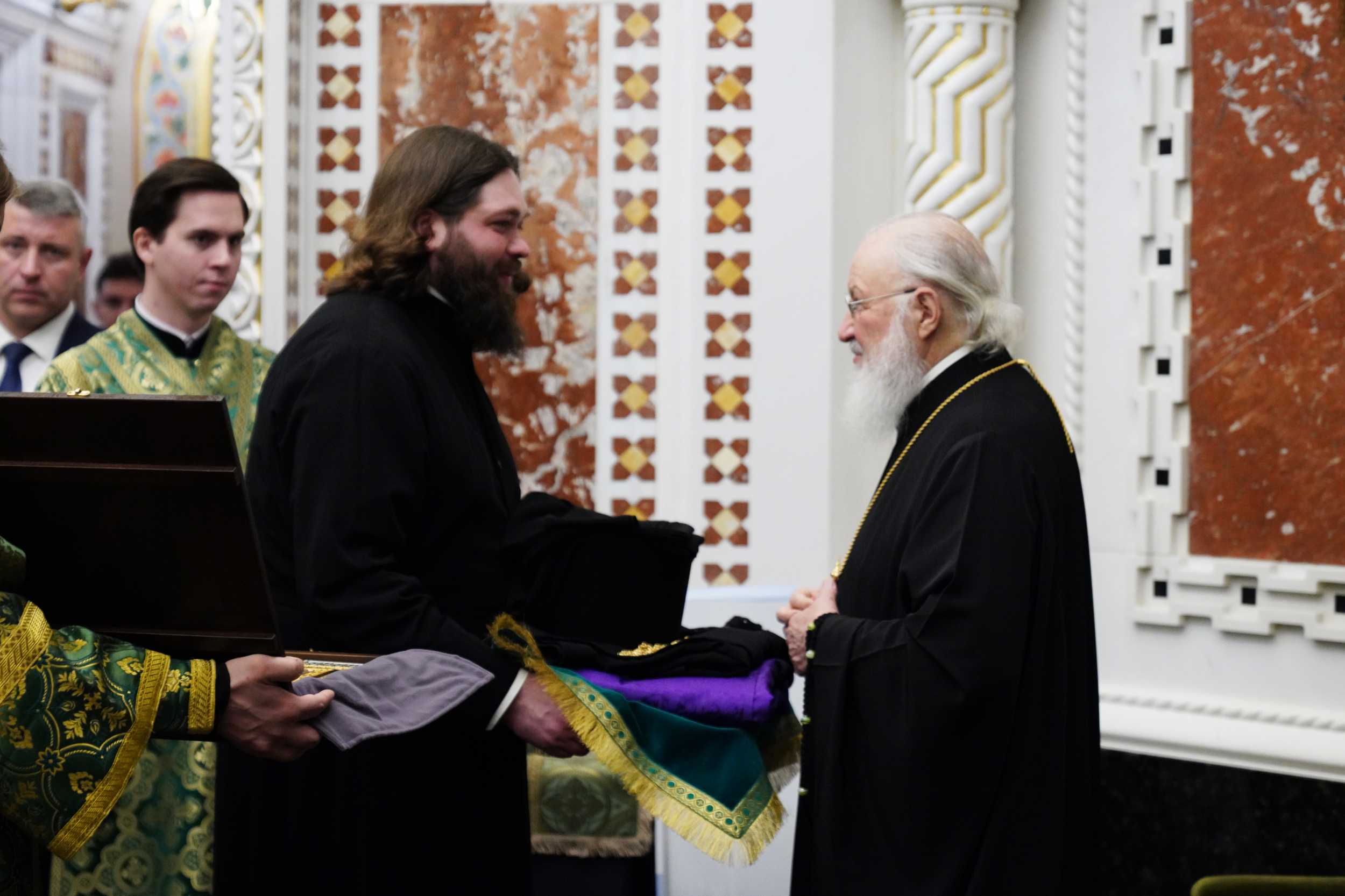 По окончании Литургии Предстоятель Русской Церкви напутствовал епископа Феодосийского и Керченского Илариона на служение и вручил ему архиерейский жезл.