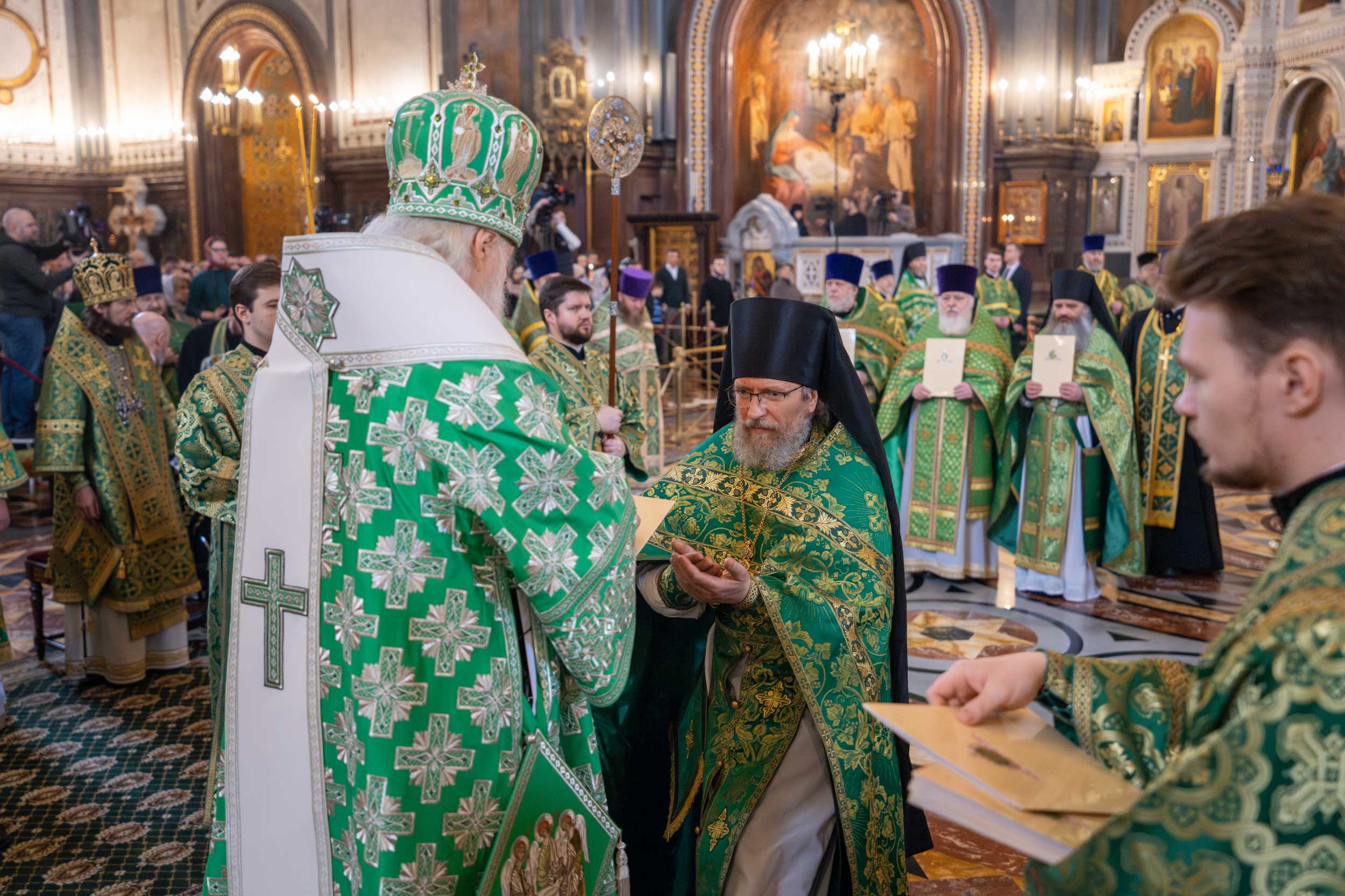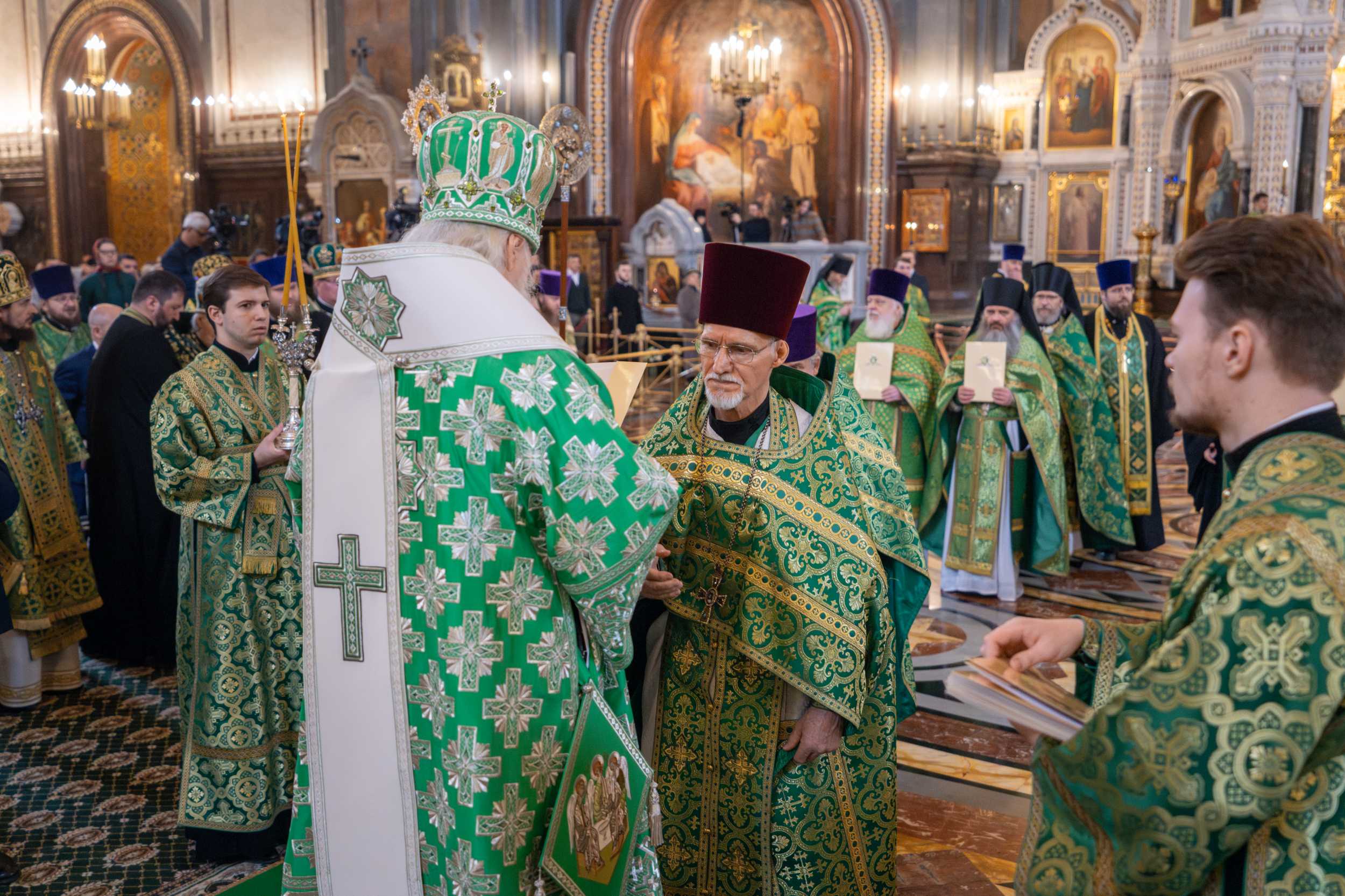 В алтаре Храма Христа Спасителя состоялось краткое общение Предстоятеля Русской Церкви с награжденными священнослужителями. От их имени к Его Святейшеству обратился настоятель храма святителя Николая Мирликийского в Толмачах г. Москвы протоиерей Николай Соколов. Святейший Владыка поздравил награжденных клириков.