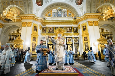 Затем Предстоятель Русской Церкви совершил чин великого освящения двух престолов воссозданного собора — главного в честь Казанской иконы Божией Матери и левого в честь благоверного князя Александра Невского. В завершение чина великого освящения, Святейший Владыка возглавил крестный ход с частицами мощей вокруг собора.